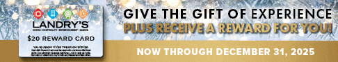 Give the gift of experience, plus receive a reward for you! For every $100 in gift cards you buy, receive a $20 reward cards.* Plus, Landry's Select Club Members earn 1.5x points! Available online only now through December 31, 2025.